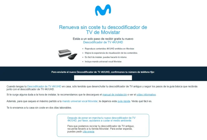 Movistar ha lanzado un plan renove para sus suscriptores de televisión por el cual pueden cambiar su anterior decodificador (HD) por uno nuevo para poder ver MovistarPlus+, de manera que podrán renovar sus dispositivos gratis si lo instala el cliente por su cuenta y a un precio de 50 euros si precisa que acuda un instalador a su domicilio. La oferta incluye, además, la renovación del mando que se tenga en casa por el Mando Vocal Movistar Plus+, con el que se puede controlar la televisión a través del asistente virtual Aura. La iniciativa es de cada cliente de la operadora, porque en esta promoción no es necesario recibir la invitación al cambio de decodificador por parte de la compañía.