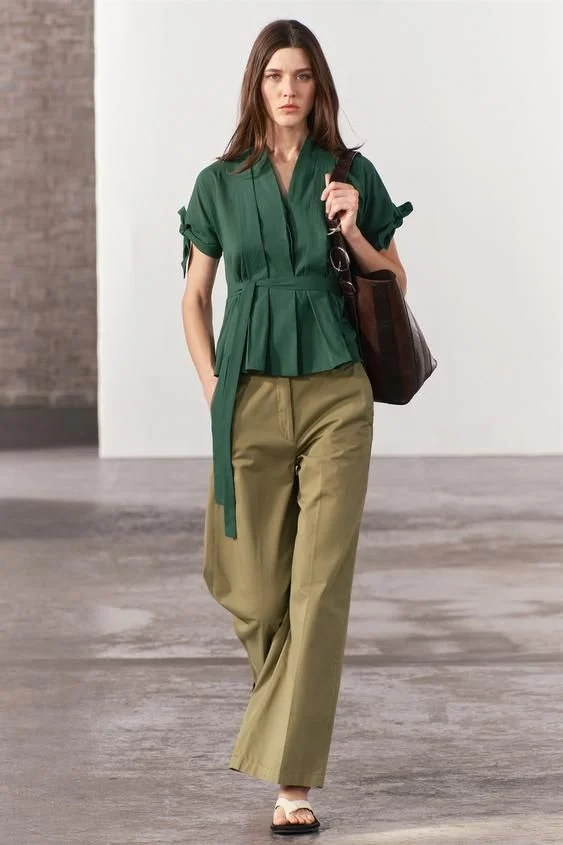 La Camisa Pliegues Cinturón ZW Collection de Zara es una prenda que destaca por su elegancia y versatilidad. Confeccionada en hilatura de algodón 100%, esta camisa ofrece un diseño sofisticado con un escote pico y mangas cortas ajustables con lazadas. El detalle de pliegues en el delantero y el cinturón de lazada en el mismo tejido añaden un toque distintivo y femenino. Su bajo asimétrico no solo aporta originalidad al diseño, sino que también facilita diversas combinaciones con otras prendas del armario, permitiendo tanto un look casual como uno más formal.