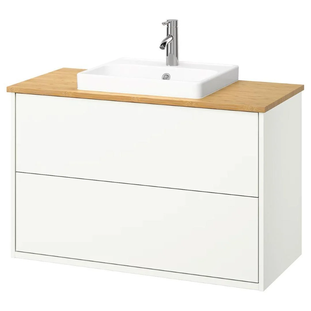 Un baño debe ser tanto bonito como práctico. Los amplios cajones del mueble HAVBÄCK y ORRSJÖN no solo ofrecen un almacenamiento generoso, sino que también contribuyen a mantener el orden y la limpieza, elementos clave en cualquier espacio bien decorado. Utiliza organizadores dentro de los cajones para separar artículos de aseo personal, toallas y productos de limpieza. Añade un toque de lujo colocando pequeños frascos de vidrio con sales de baño o aceites esenciales en una bandeja sobre la encimera.