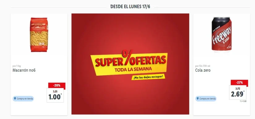 Sin ir más lejos, el consumidor no podrá buscar en la lupa aquellos productos que quiere añadir en su cesta de la compra. La página web de Lidl en cuanto a alimentación solo marca algunas promociones que el consumidor encontrará en los establecimientos físicos. En este caso, cuentan con bajadas permanentes; a partir del 17 de junio los consumidores de la cadena alemana podrán disfrutar de ofertas semanales, superofertas, fruta y verdura, pero únicamente en tienda; a partir del 21 de junio contarán con promociones de jardín, sabores de tradición, y ofertas de Superfinde.