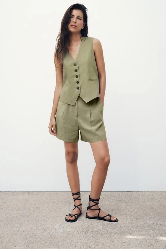 Este verano, Zara se posiciona una vez más como la elección perfecta para quienes buscan mantenerse a la moda sin sacrificar confort. El chaleco sastre, con su escote en pico y bolsillos delanteros, se combina a la perfección con las bermudas de tiro alto, creando un look armonioso y sofisticado. Las características del lino aseguran una sensación ligera y fresca, ideal para afrontar las altas temperaturas con estilo.