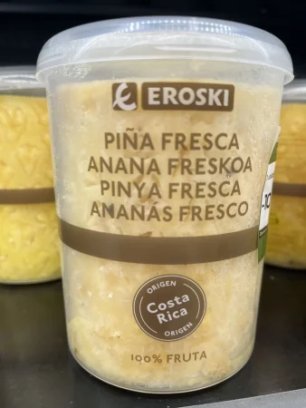 Sin ir más lejos, en la bandeja del coco cortado, el origen que ha desvelado Eroski es que vienen de la India. Por otro lado, la bandeja de fruta cortada a rodajas de piña, el producto viene desde Costa Rica. Lo que más sorprende es qué en teoría la cadena vasca solo vendía fresas nacionales y si observamos en los lineales de la fruta a granel observamos que tanto las fresas como los arándanos sí vienen de España, pero en la fruta cortada el origen no es el mismo.