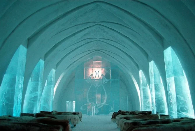 Ice Hotel, Suecia: Es uno de los hoteles más grande del mundo hecho de nieve y hielo. Los huéspedes pueden dormir en una cama de nieve y hielo, a temperaturas alrededor de menos 5 grados C, el hotel es único porque todo el edificio se derrite y se reconstruye cada año. Cada mes de noviembre, un equipo de arquitectos reconstruye las habitaciones, el bar y la capilla usando varios cientos de toneladas de hielo. Si tus vacaciones ideales consisten en pasear en pantalones de nieve y chaquetas de plumas, ICEHOTEL merece una visita. Al fin y al cabo, es un hotel diferente cada año.