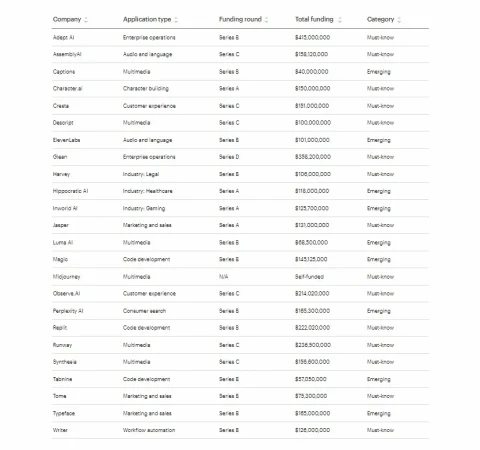 En la lista se incluyen nombres como la compañía con sede en Londres Synthesia, que genera avatares realistas para formación, atención al cliente y marketing; Glean, que ofrece un motor de búsqueda basado en inteligencia artifical para la documentación interna de las empresas; y Writer, que facilita la creación de documentación de marketing y otros tipos de contenido conforme a las normas y directrices de las marcas. Además, también aparecen compañías con soluciones especializadas, como Harvey, una herramienta de IA diseñada para bufetes de abogados y departamentos jurídicos, e Hippocratic, un modelo de IA entrenado para el sector sanitario.