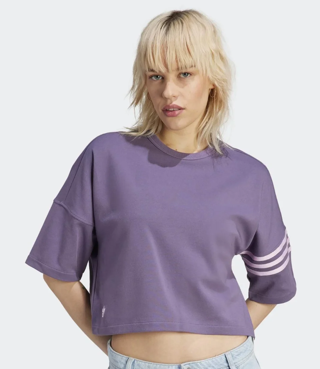 Si tu estilo es más relajado y prefieres un look urbano, la camiseta Adicolor Neuclassics es ideal para ti. Con su diseño corto y ancho, en un vibrante color morado con tres bandas rosas en una de las mangas, esta prenda es perfecta para combinar con unos vaqueros y unas zapatillas deportivas. Las mangas que llegan hasta los codos y el cuello redondo le dan un toque moderno y desenfadado.