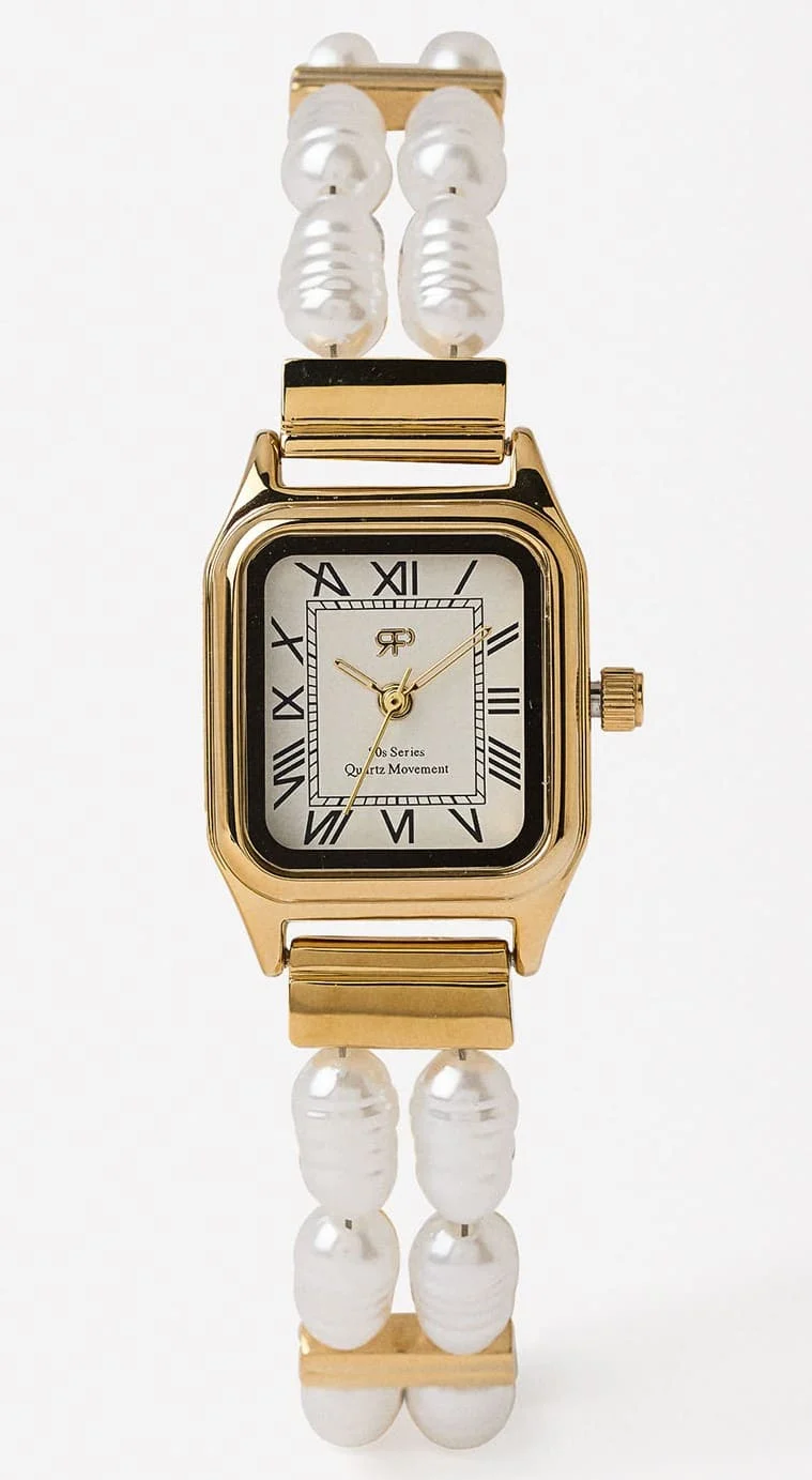 Otro modelo que se destaca en la colección de Parfois es el reloj con correa de perlas, un diseño que combina la elegancia tradicional con un toque moderno. Este reloj presenta una esfera cuadrada con números romanos, evocando la relojería clásica, mientras que la correa, una mezcla de perlas artificiales y piezas de acero inoxidable dorado, aporta un toque de lujo y sofisticación.