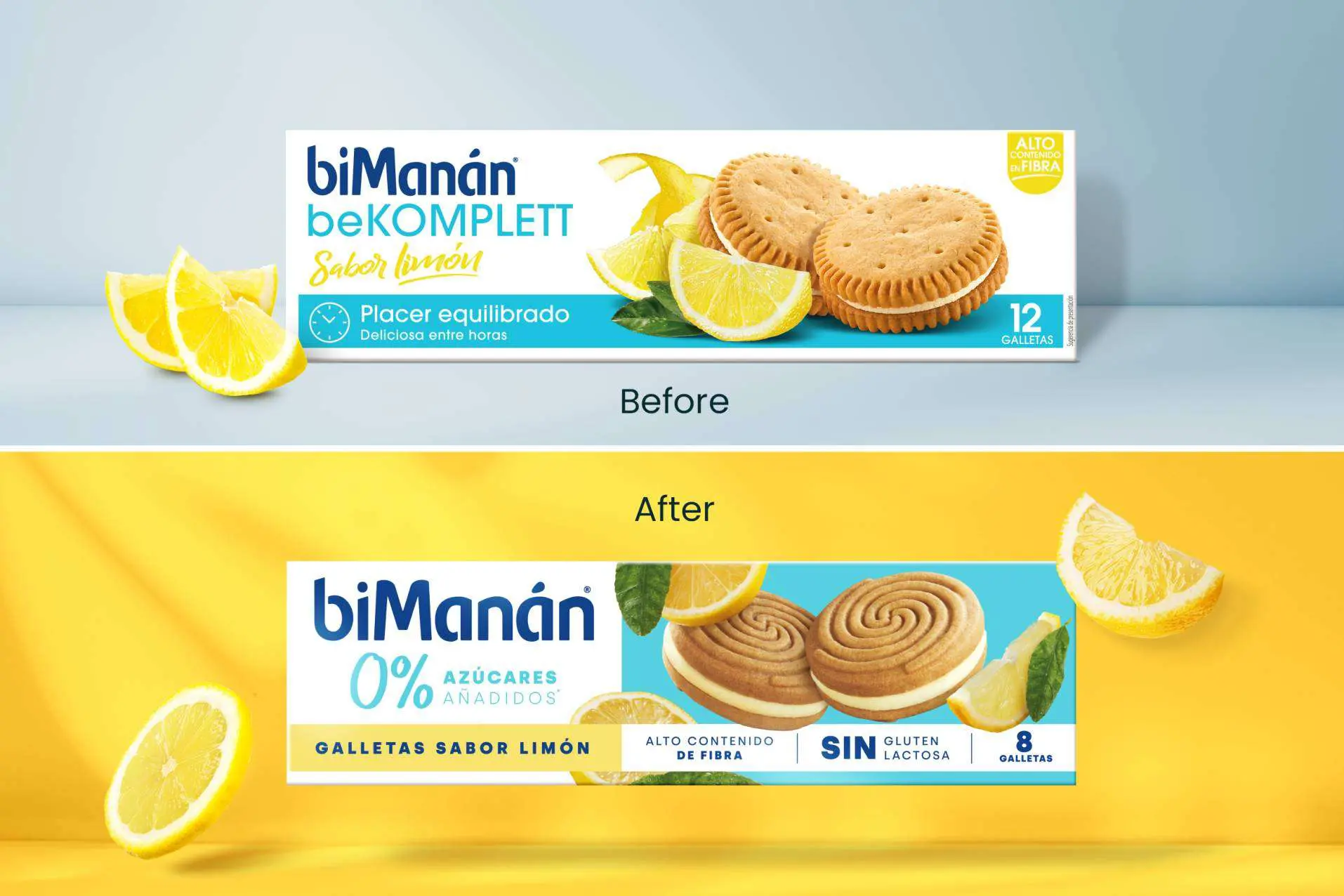 Un aspecto destacado de esta renovación fue la creación de un nuevo enfoque visual centrado en la apetitosidad y el placer sensorial de los productos. Los envases ahora presentan imágenes vibrantes y atractivas que transmiten una explosión de sabor. Por ejemplo, el batido de chocolate pasa de un visual inerte a una explosión alrededor de un vaso de cristal y las galletas de limón vuelan con rodajas de limón en el facing. Estos elementos invitan a los consumidores a disfrutar del proceso de adelgazamiento sin sentir que se están privando de placer «Me cuido, ¡no me castigo!»