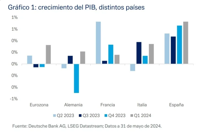 “El primer trimestre de 2024 se cerró con un crecimiento del 2,5% anual, por encima de lo esperado. Se espera que en el conjunto del año el crecimiento del PIB se eleve un 2% frente al 0,7% previsto para la Eurozona”, indican.