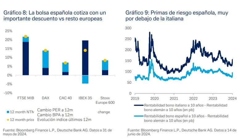 Por el lado de los mercados, en Deutsche Bank apuntan que “el índice Ibex ha tenido en 2024 un comportamiento positivo, llegando a superar los 11.500 puntos a cierre de mayo, si bien la reciente incertidumbre ligada a las elecciones legislativas francesas le ha pasado factura y se sitúa a cierre de este informe cerca de los 11.000 puntos.”