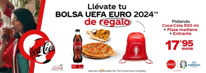 En este caso, hay que hacer hincapié en qué una de las promociones que ya tenía Pizzería Carlos era una pizza mediana más un refresco de 500 ml por tan solo 14,95 euros, siendo tres euros más económicos que la promoción específica para la Eurocopa. No obstante, esa diferencia de tres euros compensa con un entrante y un regalo como una bolsa de promocional de Coca-Cola.