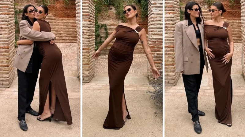Vamos a destacar tres detalles del vestido que llevó Dulceida en el casamiento de la modelo Ana Moya y el futbolista Diego Conde. El primero es el detalle de diseño elástico y el fruncido que tiene a uno de los costados. Es importante destacar esto, ya que ajusto a la perfección sin la necesidad de apretarle la panza que por cierto, lucia preciosa con el color marrón. El segundo, el escote asimétrico con el mismo detalle fruncido.