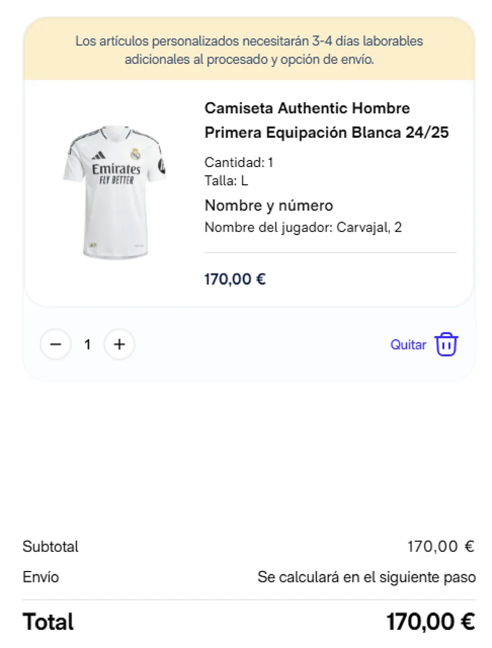 «Debido a la alta demanda actual, los artículos de la colección de Kylian Mbappé para la temporada 2024/25 podrían experimentar demoras en la entrega de hasta 4-6 semanas adicionales, independientemente del método de envío seleccionado«, informó el Real Madrid en su página web el día de lanzamiento. Esta notificación afecta tanto a pedidos exclusivos de la colección del frances como a aquellos que incluyen productos combinados. En comparación, los artículos no personalizados de otros futbolistas como Carvajal, Rodrygo y Bellingham tienen un tiempo de espera más corto, requiriendo solo 3-4 días adicionales para procesamiento y envío según se indica al finalizar la compra.