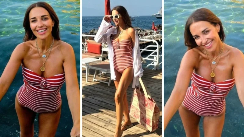 Desde su cuenta de Instagram, Paula Echevarría compartió un book de fotos de un viaje que hizo a Sorrento junto a su esposo y en la misma, se la puede ver con un traje de baño. El mismo es de cuerpo entero y con un detalle en el busto de un broche en el centro. Este está combinado con una camisa blanca y un bolso para el momento. Le sumó complementos como cadenitas del jo turco y el árbol de la vida.