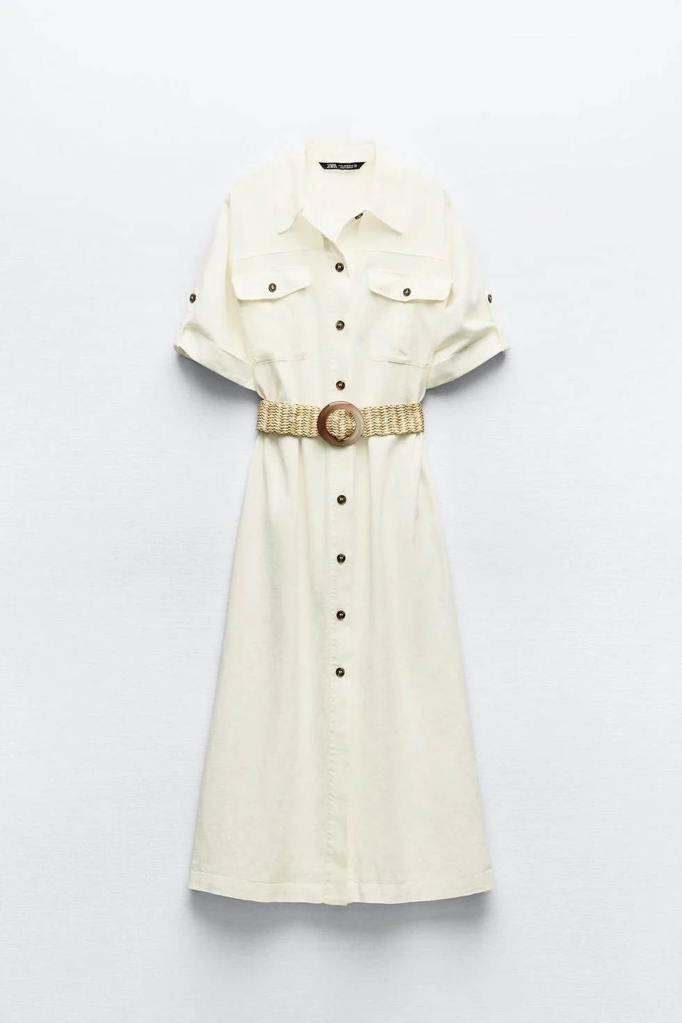 El vestido camisero blanco es una opción ideal para el entorno laboral. Su diseño con cuello solapa y escote en pico aporta una elegancia sutil, mientras que el cinturón de rafia resalta la cintura. Combínalo con zapatos de tacón medio y un bolso estructurado para un look profesional.