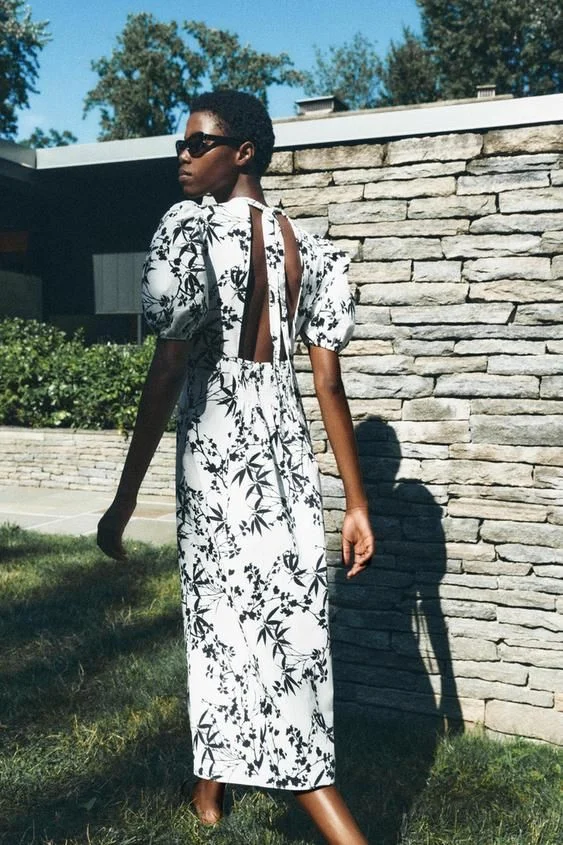 El vestido largo estampado de la ZW Collection de Zara, a un atractivo precio de 39,95 EUR, es la opción perfecta para quienes buscan una combinación de estilo y confort. Este vestido midi está confeccionado en hilatura de algodón 100%, proporcionando una textura ligera y transpirable que es ideal para diversas ocasiones. Presenta un cuello redondo y mangas cortas abullonadas, con un acabado en elástico que añade un toque moderno y femenino. El detalle de pliegues en la cintura ayuda a definir la silueta, mientras que el bajo acabado en línea evasé ofrece un movimiento fluido y elegante.