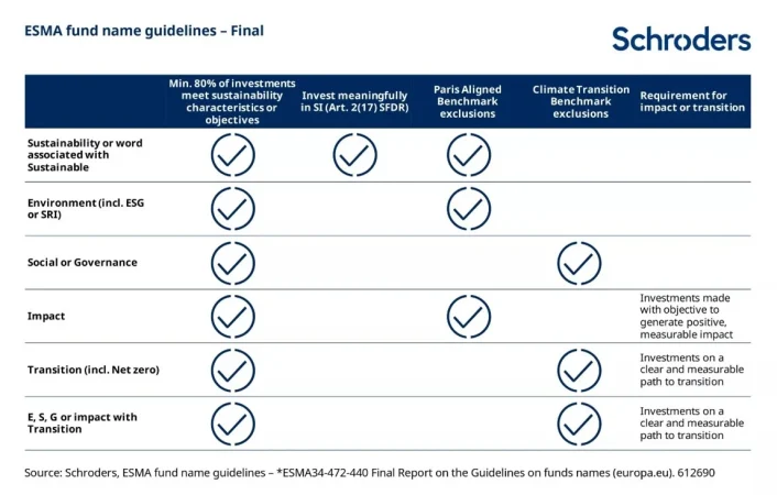 Nathaële Rebondy, responsable de Sostenibilidad para Europa: Las directrices de la ESMA sobre las denominaciones de los fondos, que se resumen en el siguiente cuadro, tienen varias implicaciones importantes. Un punto clave es que todos los fondos con términos relacionados con la sostenibilidad/ impacto/ ASG, etc. en sus nombres deben garantizar que al menos el 80% de sus inversiones cumplen características u objetivos de sostenibilidad.