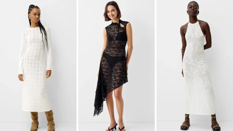 Hemos escogido 3 opciones de vestidos, el primero es en color blanco, calado estilo rústico de manga larga ajustada y con una falda que llega pasando las rodillas. De cuello redondo y al cuerpo. Su costo es de 29,99 euros y los talles son del XS hasta el XL. La segunda opción es muy similar al de Paula Echevarría, pero por la transparencia que lleva. En negro y con una tela de encaje que des al descubierto que es lo que hay debajo.