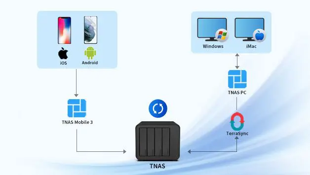Con TNAS Mobile 3, los usuarios pueden hacer copias de seguridad de los datos de sus teléfonos en TNAS. Con el servidor TerraSync en TNAS PC, los datos de TNAS se pueden sincronizar con el ordenador, lo que permite una comunicación de datos perfecta entre dispositivos móviles, ordenadores y TNAS. La integración perfecta de TNAS PC y TNAS Mobile 3 ofrece a los usuarios una solución integral de gestión de los datos móviles. Ya sea en casa, en la oficina o de viaje, los usuarios pueden hacer copias de seguridad, sincronizar y administrar fácilmente sus datos.