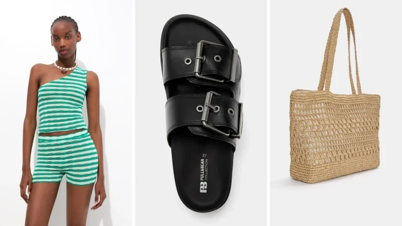 No solo hemos encontrado el mismo conjunto que Dulceida, también como combinarlo y que quede perfecto. De dos piezas en color verde agua y blanco con estampado de líneas. Esta pieza se vende por separado, por lo que tiene dos costos diferentes, pero ambos tienen un valor de 34 euros. Es fresco, cómodo y tanto para pasear como para ir a la playa es válido. A este le podemos sumar unas sandalias bajas en negro de hebillas que tiene un valor de 32,99 euros.
