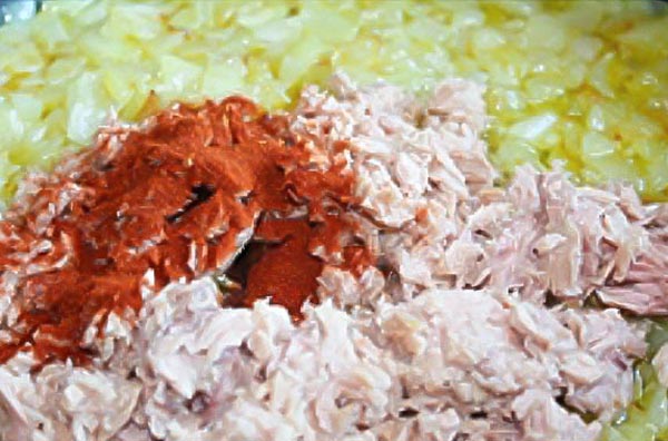 - Preparar el relleno: en un bol grande, mezcla el atún al natural previamente desmenuzado, los pepinillos troceados y el huevo cocido picado. Añade las verduras pochadas y tomate frito al gusto. Remueve bien para que todos los ingredientes queden bien integrados.
