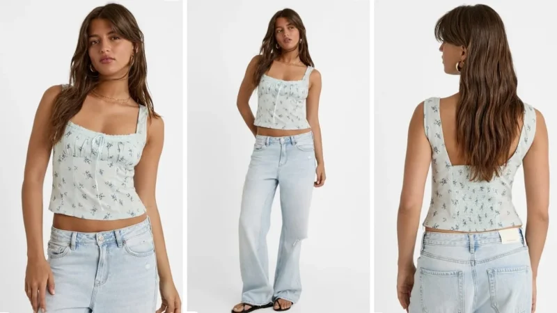 El top es un sueño y es uno con los que más se puede jugar a la hora de hacer un look. Una de las prendas que combina perfecto es con un jean o vaquero. Sea ajustado o suelto va perfecto, pero si es blanco o en azul claro mucho mejor, para que haga juego con el color blanco y las flores de la parte superior y no se pierda. Si le sumas unas sandalias planas negras, mucho mejor. Otras tiendas como Mango, Zara o Porfois también se suman a las rebajas de remate.