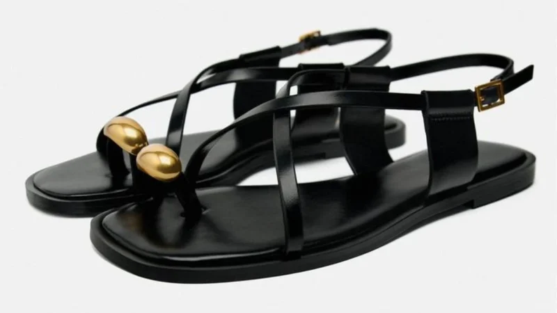 Son sencillas a simple vista, pero que combinaba con todo. Hablamos de unas sandalias plana con tiras finas y adorno metálico en el dedo gordo y con un cierre mediante hebilla detrás del tobillo. Lo sujeta por completo evitando que puedas tener un accidente o ese chancleteo al caminar que puede ser molesto y con el tiempo doloroso. Viene en color negro y su costo en Zara es de 30 euros.