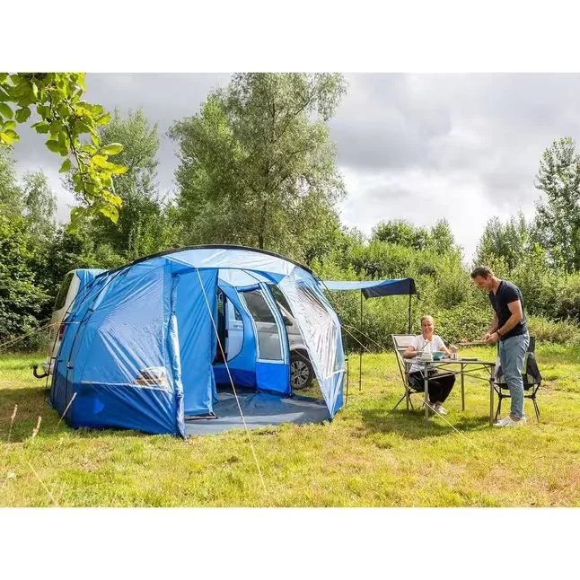 La tienda de campaña SKANDIKA Aarhus Travel está diseñada para quienes buscan una solución versátil y cómoda para acampar con su furgoneta. Con una superficie habitable de 10 m² y una altura de 205 cm, esta tienda ofrece un amplio espacio para dos personas en un dormitorio acogedor. Su diseño de túnel maximiza el aprovechamiento del espacio, y su estructura incluye mosquiteras en las entradas y ventanas para mantener el interior libre de insectos. La Aarhus Travel también cuenta con un toldo solar y una columna de agua de 3000 mm, lo que asegura protección contra la intemperie en cualquier clima.