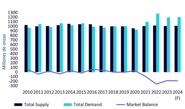 Fuente: Metals Focus y WisdomTree. Julio de 2024. (F) = Previsiones. Las previsiones no son un indicador de la rentabilidad a futuro y las inversiones están sujetas a riesgos e incertidumbres