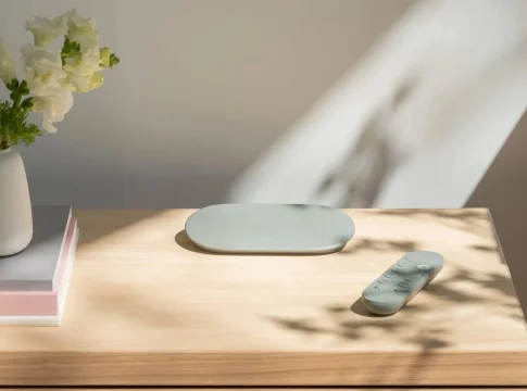 El nuevo Google TV Streamer 4K se presenta con un cambio radical de diseño, porque deja de ser como un USB o pequeña llave que se conectaba al televisor por la parte de atrás, y se ha convertido es una pequeña estación, como si fuera un descodificador, que se apoya en mueble de TV, con su mando a distancia coordinado. Su diseño es elegante, redondeado, en color porcelana o gris, compatible con cualquier decoración actual.