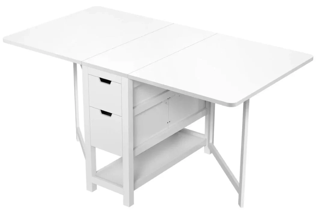 La mesa cuenta con dos tableros laterales abatibles que pueden abrirse o cerrarse según las necesidades, lo que permite ajustar su tamaño en función del espacio disponible. Además, incorpora cuatro cajones centrales que ofrecen un almacenamiento adicional, perfecto para mantener el orden en casa. Este mueble no solo es ideal para ser utilizado como mesa de comedor, sino que también se adapta a la perfección como escritorio en una oficina en casa o como mesa auxiliar en cualquier rincón del hogar. La estructura de la mesa es robusta, con patas sólidas que garantizan estabilidad, y su acabado en blanco la hace fácilmente combinable con cualquier decoración.