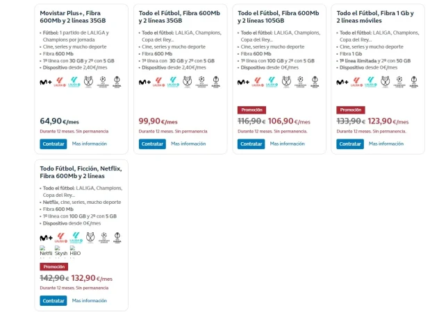 Esta promoción (Fibra y Móvil sin permanencia-oferta miMovistar) es aplicable tanto a nuevos clientes como a los ya clientes que decidan añadir el paquete Todo el Fútbol, sin ningún compromiso de permanencia, y estará vigente durante todo el verano.