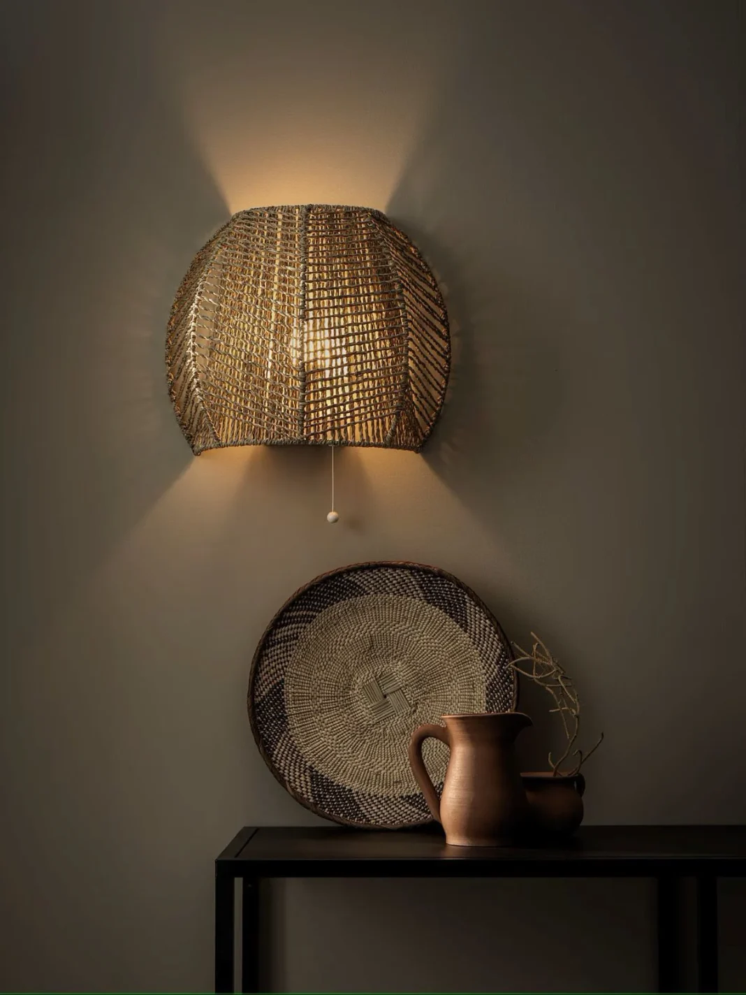 El uso de juncos naturales no solo añade un elemento estético distintivo, sino que también tiene un impacto directo en la calidad de la luz que emite la lámpara. Cuando se enciende, la luz atraviesa los huecos del trenzado, proyectando sombras suaves y creando un ambiente acogedor y relajante. Esta capacidad para difundir la luz de manera cálida y envolvente es lo que diferencia a la MÅNALG de otras lámparas de pared.