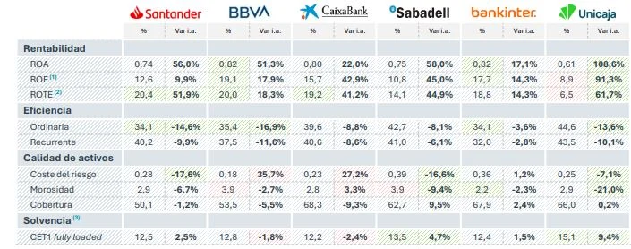 Respecto a la solvencia, en todos los casos la ratio CET1 fully loaded supera el 12%, destacando Unicaja (15,1%) como la entidad que presenta mejor ratio, seguida de Banco Sabadell (13,5%); esto indica que la gran banca española continúa gozando de una gran salud y que con el exceso de capital (existente sobre esa barrera del 12%), puede mejorar la remuneración de los accionistas o llevar a cabo operaciones corporativas.