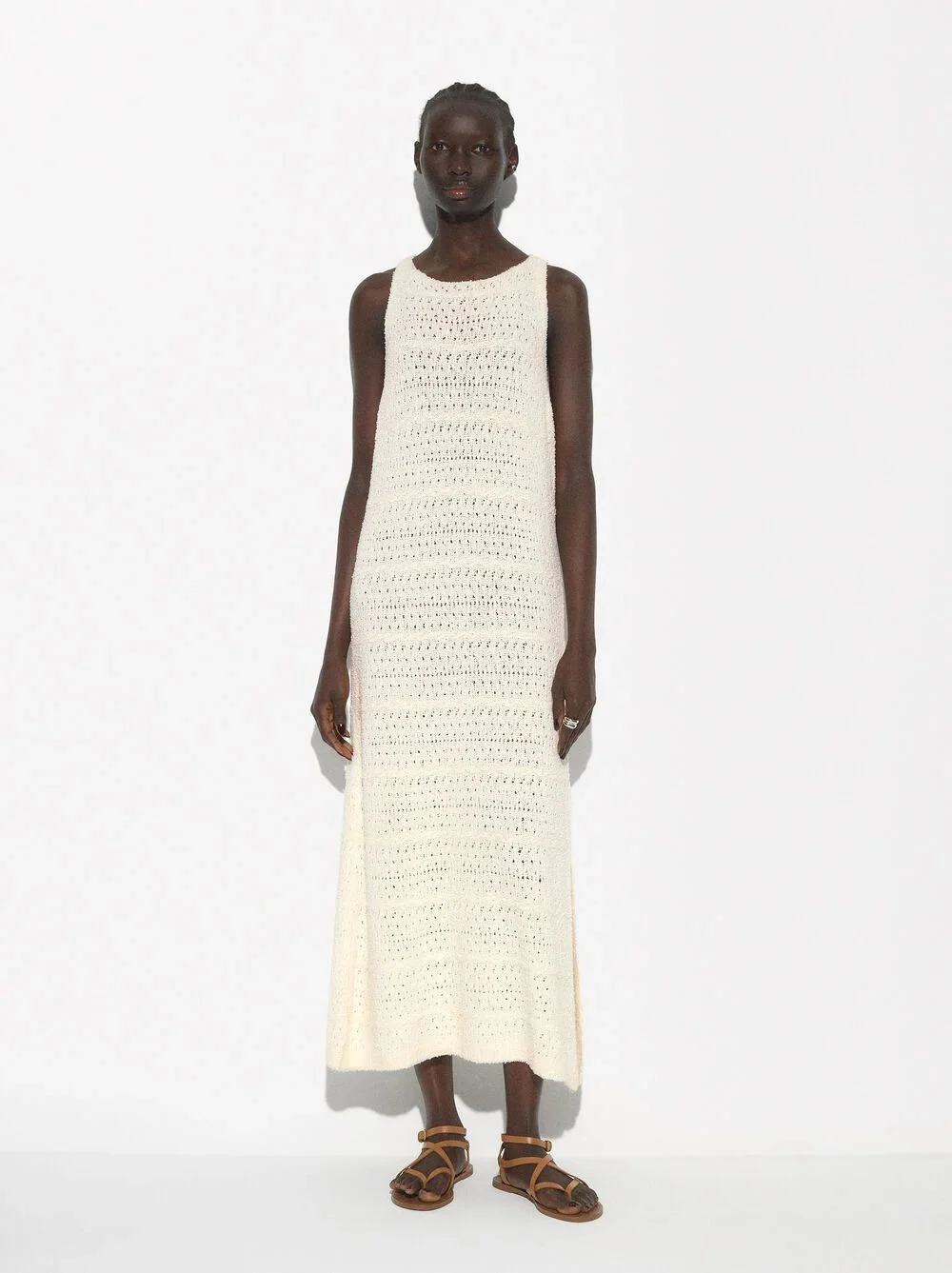 El vestido largo de punto de Parfois, a un precio de 35.99€, es la elección ideal para quienes buscan elegancia y frescura en su vestuario veraniego. Este vestido presenta un diseño sin mangas con un cuello redondo que realza un estilo sencillo y sofisticado. La espalda abierta, con tirantes para ajustar en la parte superior, añade un toque moderno y coqueto, perfecto para los días cálidos.