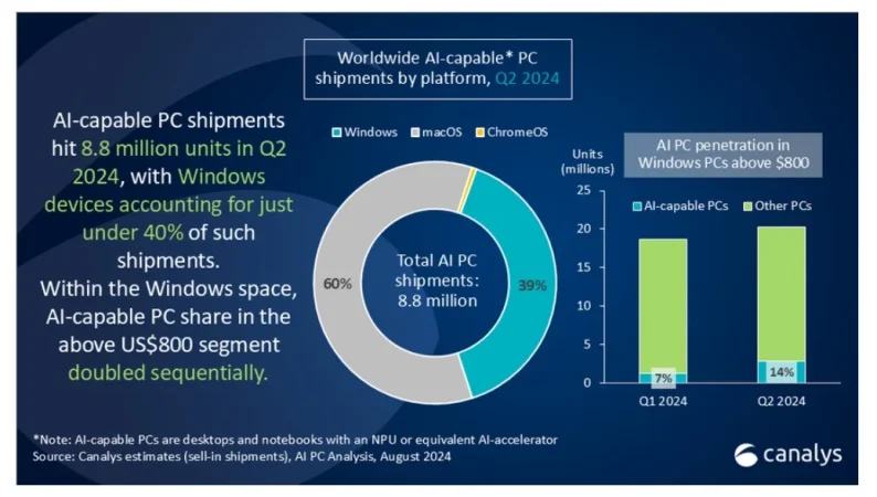 Los analistas de Canalys, que se mantienen al día en incorporaciones de habilidades de inteligencia artificial y su repercusión en las ventas desde que se anunciaran a finales del pasado año por las diferentes marcas, tienen claro que ahora ya «existe una base sólida establecida, por lo que los envíos de PC con capacidad de inteligencia artificial están preparados para ganar más impulso en la segunda mitad de 2024″, según ha asegurado el analista principal de la consultora, Ishan Dutt.