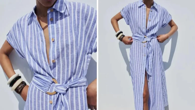 El vestido camisero a rayas de Zara es una opción destacada para quienes buscan un look sofisticado y actual. Con un diseño que mezcla el estilo clásico y moderno, este vestido cuenta con un estampado de rayas verticales en una base azul clara, evocando el estilo marinero que sigue siendo tendencia. El vestido tiene mangas cortas, un cuello tipo camisero y botones frontales que permiten ajustar el escote según el gusto personal.