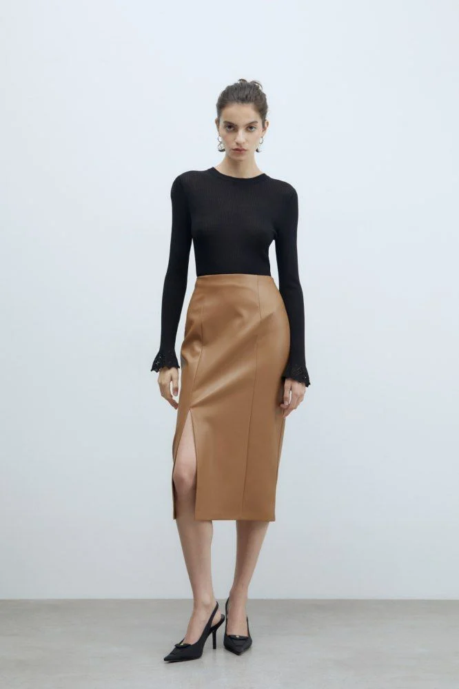 Transforma tu look con la falda midi efecto piel de Sfera, una pieza que combina sofisticación y funcionalidad. Este modelo presenta un elegante diseño midi con un cierre trasero de cremallera, lo que no solo añade un toque de estilo, sino que también garantiza un ajuste perfecto. Fabricada en 100% poliéster, la falda ofrece la apariencia de piel con la comodidad y resistencia de un material de alta calidad, haciéndola ideal para cualquier ocasión.