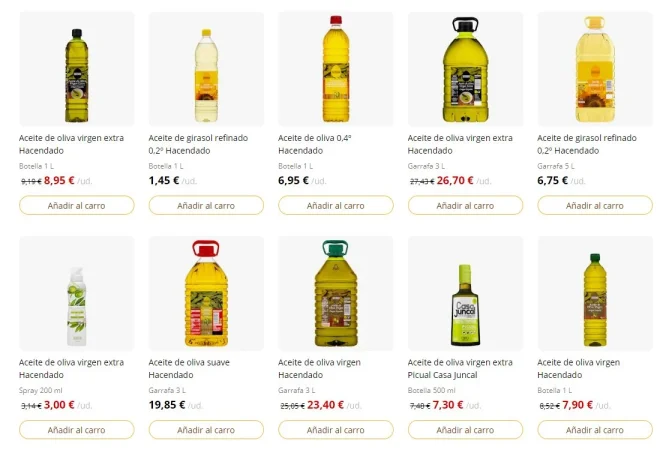 Si nos centramos en los precios del aceite en los lineales de Carrefour, podemos observar una gran diferencia entre los precios de la marca propia de la cadena de distribución francesa en comparación con el resto de marcas como Hojiblanca o Coosur, entre otras. Sin ir más lejos, 1 litro de aceite de oliva virgen extra de Maestros de Hojiblanca es de 13,90 euros; una botella de 1 litro de aceite de oliva original Carbonell, el cliente pagará 11,85 euros; el aceite de oliva virgen extra de Carbonell pasa a costar 15,19 euros; y el aceite de oliva virgen extra de Coosur 15,33; entre otras marcas y precios.