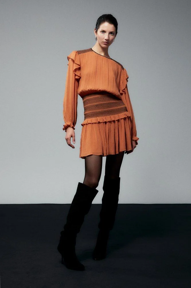 El vestido corto de manga larga con cuello redondo de Sfera destaca por su diseño distintivo y su tejido elástico tipo nido de abeja en la cintura. Este detalle proporciona un ajuste cómodo y favorecedor, mientras que la falda acabada en volantes añade un toque de movimiento y feminidad. A un precio de 39,99 €, esta prenda ofrece una notable relación calidad-precio, permitiendo a las fashionistas disfrutar de un look sofisticado sin gastar de más.