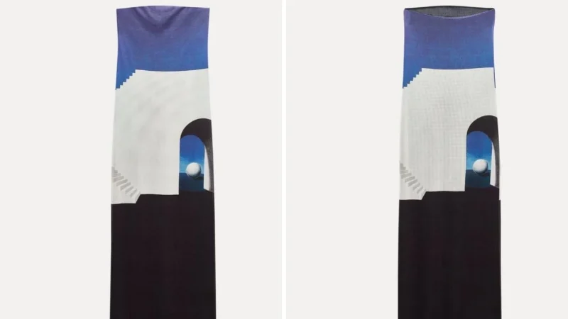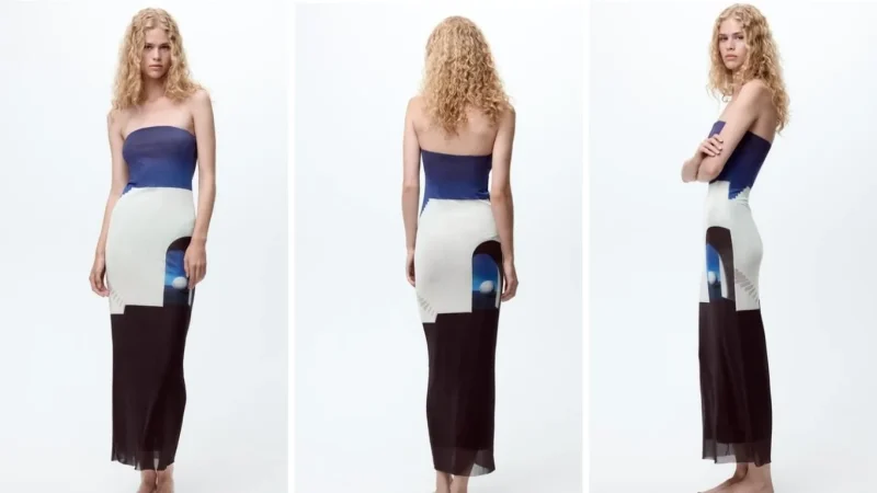 El nuevo vestido de Zara es una pieza destacada en la colección de otoño, diseñado para quienes desean hacer una declaración de estilo a su regreso al entorno laboral. Con un escote recto y hombros descubiertos, el vestido presenta una estampación combinada a contraste inspirada en el arte de René Magritte, aportando un aire artístico y sofisticado a la prenda.