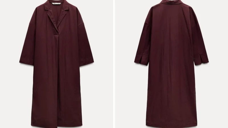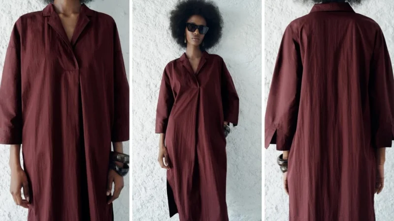 Zara presenta dos vestidos camiseros que se han convertido en los favoritos de la temporada. El primero es un elegante vestido en color rojo burdeos, una de las tonalidades más en tendencia para este otoño. Este vestido, con un precio de 39,95 euros, se destaca por su diseño de manga francesa de 3/4 y un corte midi que combina a la perfección frescura y calidez. Disponible en tallas que van del S al L, este modelo es ideal para quienes buscan una prenda versátil que se pueda adaptar tanto a días fríos como cálidos.