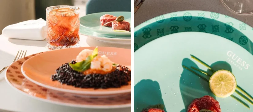 En cuanto a los platos, los vasos y las copas de cocktail, todas tendrán detalles del logo de Guess o de alguna serigrafía popular de la firma de lujo. «Estos elementos se combinan para crear una atmósfera exclusiva y lujosa, invitando a los huéspedes a sumergirse en la belleza y la elegancia mientras disfrutan de un delicioso plato, café o cóctel, convirtiéndolo en el lugar ideal para relajarse después de las compras o de un día en el mar», indican desde Guess en su propia página web.