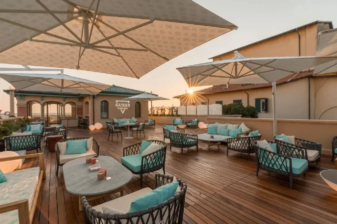 En este contexto, hace tan solo tres semanas, Guess abrió su primer café y lounge de cocktails, en la terraza de la nueva tienda, con vistas al mar de la costa toscana, en Italia. Un nuevo espacio que sustituye la histórica tienda de la firma en Viareggio, ya que han realizado un rediseño con una superficie de 600 metros cuadrados con un nuevo concepto, que, además, cuenta una terraza y balcón para abrirse al sector de la restauración.