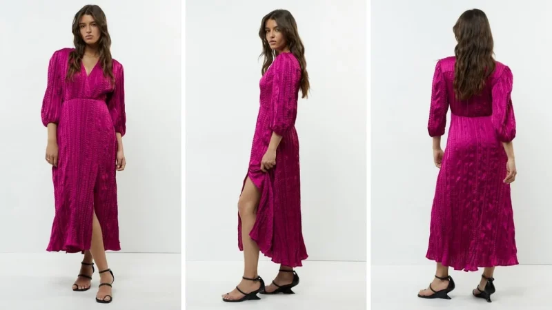 El vestido está disponible en dos colores que capturan la esencia de la temporada: un rosa delicado y un verde vibrante. Ambos tonos ofrecen una versatilidad increíble y se adaptan a diferentes tonos de piel, permitiendo a cada mujer encontrar el matiz que mejor resalte su estilo personal. La confección de la prenda asegura un acabado elegante con un efecto arrugado que aporta un toque distintivo y a la moda.