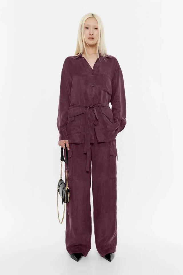 La camisa fluida en color burdeos de Bimba y Lola es una pieza destacada para quienes buscan elegancia y comodidad en su vestuario. Confeccionada en viscosa de alta calidad, esta camisa larga presenta un corte recto que se complementa con un cuello camisero pronunciado y mangas largas con puños abotonados. El diseño incluye un cierre frontal con botonadura y bolsillos de fuelle en el delantero, añadiendo funcionalidad al estilo. El cinturón de tejido en el mismo tono realza la cintura y permite ajustar la prenda a tu gusto, creando un look versátil y sofisticado.