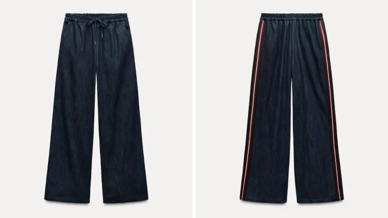 Los pantalones de Zara que están marcando tendencia esta temporada se presentan como una ingeniosa alternativa a los tradicionales jeans. Confeccionados en un tejido que imita el efecto denim, estos pantalones cuentan con una banda lateral en tono rojo y blanco que les da un toque deportivo y moderno. La prenda se distingue por su tiro alto y su cintura elástica ajustable con cordones, garantizando un ajuste cómodo y personalizado. Además, incluyen prácticos bolsillos laterales que aportan funcionalidad y estilo al diseño.