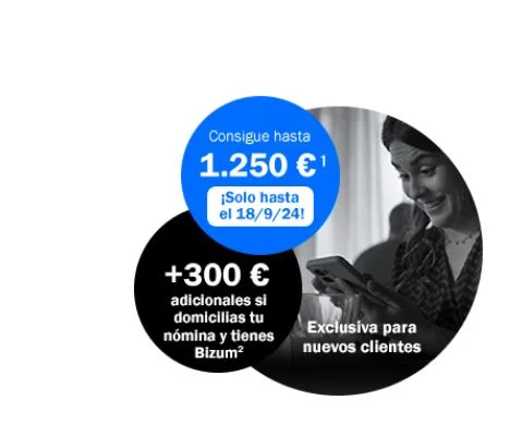 “Cuenta remunerada para tu día a día, exclusiva para nuevos clientes. Contrátala hasta el 18 de septiembre. Llévate ahora hasta 1.250 € el primer año. Rentabilidad del 2,5% TAE para un saldo máximo de 50.000 € y y además, 300 adicionales por domiciliar tu nómina y tener Bizum. Te devolvemos el 3% de tus recibos domiciliados de luz y gas, sin límite de importe y hay tarjeta de débito y crédito gratis, sin comisiones de emisión ni mantenimiento”.