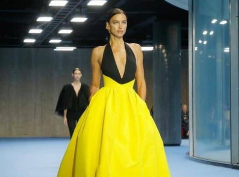 Uno de los momentos más destacados del desfile fue la aparición de la reconocida modelo Irina Shayk. Ella deslumbró a la audiencia con un vestido de fiesta de escote palabra de honor, que combinaba colores amarillo y negro, encarnando el glamour absoluto de la colección. Este vestido se ha convertido en un símbolo del enfoque moderno que Gordon ha implementado desde que asumió el control de la firma en 2017.