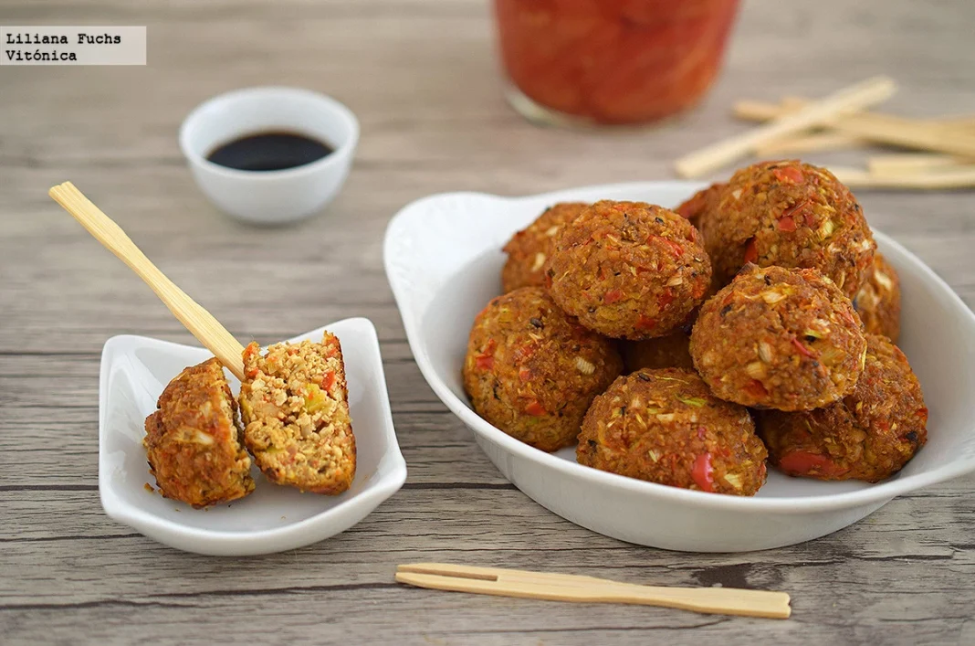 Sirve las albóndigas de patata con quinoa bañadas en la salsa de tomate caliente. Para acompañarlas, una ensalada fresca de hojas verdes con aguacate y tomate cherry es una excelente opción. También puedes servirlas con un poco de arroz integral o una rebanada de pan integral tostado. Como bebida, un vino blanco ligero o una limonada casera fresca combinan perfectamente.