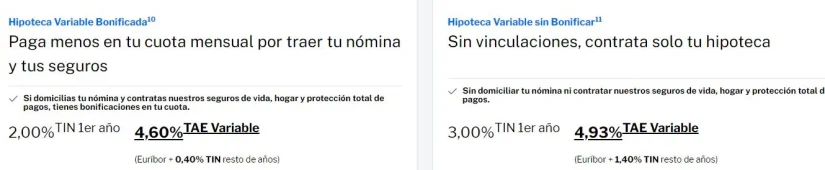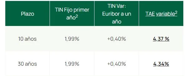 Con bonificaciones, los dos primeros años se paga 2,20 % TIN y el resto de años desde Euribor +0,48 % TIN, con una TAE variable desde 3,88 %, mientras que sin bonificaciones, los dos primeros años paga «2,60 % TIN y resto años desde Euribor +0,88 % TIN, con una TAE variable del 4,08%».